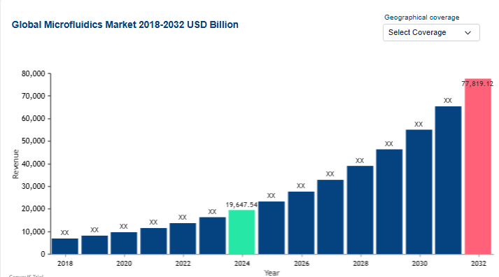 The demand for rapid, point-of-care diagnostics and the miniaturization of laboratory processes are driving an unprecedented era of growth in fluid dynamics. The Microfluidics Market was valued at USD 19,647.54 billion in 2024 and is projected to reach USD 77,819.12 billion by 2032, growing at an extraordinary CAGR of 24.81% during the forecast period of 2025 to 2032. This expansion is fueled by the integration of "Lab-on-a-Chip" (LoC) technologies, which allow for complex chemical and biological analyses to be performed using microliter volumes of fluids.